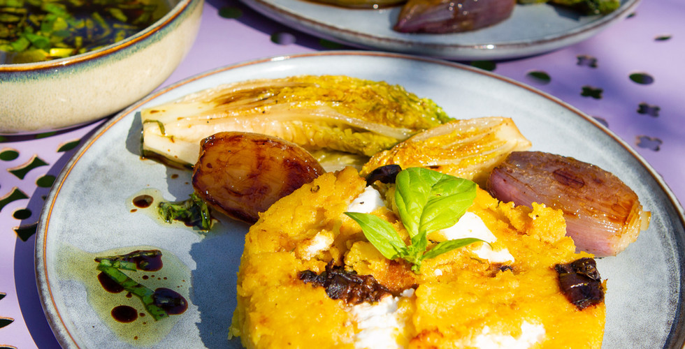 Galettes de polenta olives & Féta, sucrines et échalotes confites rôties