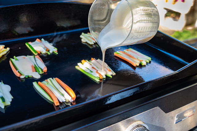 Étape 4 : Allumez votre plancha à feu moyen, disposez sur une moitié de la plancha les rondelles de pamplemousse en les arrosant de sirop (gardez une partie du sirop pour sucrer le fromage blanc) et faites-les rôtir de chaque côté 3 à 4 minutes.